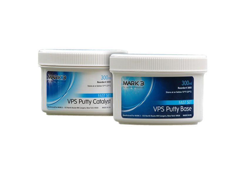 Description: MARK 3 VPS Putty Impression Material 300ML Each Base & Catalyst - Non-sticky with exceptional dimensional stability and superior elastic properties (high elastic memory).